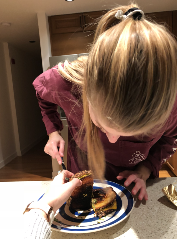 Fast forward 30 minutes — I’m zoning out as she flips my 2nd avocado grilled cheese, which is normally the best meal in her wheelhouse. Tonight, she burned the bread… bad. Hilariously bad. So bad, I needed proof: